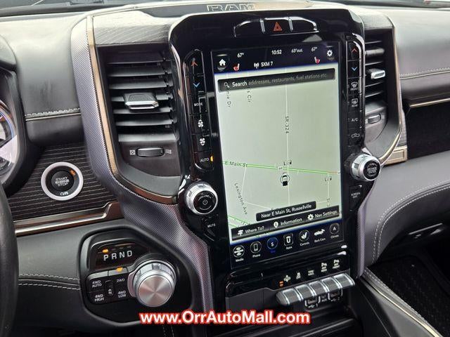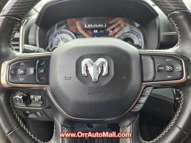 Night Edition (Accent Color Premium Power Mirrors, Black Day Light Opening Moldings, Black Exterior Truck Badging, Black Grille Surround Texture 7 Chrome, Black Headlamp Bezels, Black Painted Exterior Mirrors Caps, Body Color Door Handles, Body Color Front Bumper, Body Color Rear Bumper w/Step Pads, Dual Exhaust w/Black Tips, harman/kardon 19 Speaker Premium Sound, RAM Grille Badge - Black, Sport Performance Hood, Tow Hooks, Tri-Fold Tonneau Cover, and Wheels: 22" x 9" Black Aluminum), Quick Order Package 28M Limited, 1-Yr SiriusXM Guardian Trial, 10 Speakers, 3.21 Rear Axle Ratio, 4-Wheel Disc Brakes, 48V Belt Starter Generator, 4G LTE Wi-Fi Hot Spot, ABS brakes, Adjustable pedals, Air Conditioning, Alloy wheels, AM/FM radio: SiriusXM with 360L, Apple CarPlay, Apple CarPlay/Android Auto, Audio memory, Auto High-beam Headlights, Auto-dimming door mirrors, Auto-dimming Rear-View mirror, Auto-leveling suspension, Automatic temperature control, Bodyside moldings, Brake assist, Bumpers: chrome, Chrome Exterior Mirrors, Compass, Delay-off headlights, Disassociated Touchscreen Display, Driver door bin, Driver vanity mirror, Dual front impact airbags, Dual front side impact airbags, Electronic Stability Control, Emergency communication system: SiriusXM Guardian, For More Info, Call 800-643-2112, Front anti-roll bar, Front Bucket Seats, Front Center Armrest w/Storage, Front dual zone A/C, Front fog lights, Front License Plate Bracket, Front reading lights, Front wheel independent suspension, Fully automatic headlights, Garage door transmitter, Genuine wood console insert, Genuine wood dashboard insert, Genuine wood door panel insert, Google Android Auto, GPS Antenna Input, GPS Navigation, HD Radio, Heated door mirrors, Heated front seats, Heated rear seats, Heated steering wheel, Illuminated entry, Integrated Center Stack Radio, Integrated Voice Command w/Bluetooth®, Leather steering wheel, Low tire pressure warning, Memory seat, Navigation System, Occupant sensing airbag, Outside temperature display, Overhead airbag, Overhead console, Panic alarm, ParkView Rear Back-Up Camera, Passenger door bin, Passenger vanity mirror, Pedal memory, Power door mirrors, Power driver seat, Power passenger seat, Power steering, Power windows, Premium Leather Trimmed Bucket Seats, Radio data system, Radio: Uconnect 12 w/Navigation, Rain sensing wipers, Rear anti-roll bar, Rear seat center armrest, Rear step bumper, Rear window defroster, Remote keyless entry, Security system, SiriusXM Radio Service, SiriusXM Satellite Radio, SiriusXM Traffic Plus, SiriusXM Travel Link, Speed control, Split folding rear seat, Steering wheel mounted audio controls, Tachometer, Telescoping steering wheel, Tilt steering wheel, Traction control, Trip computer, Turn signal indicator mirrors, USB Host Flip, Variably intermittent wipers, Ventilated front seats, Voltmeter, and Wheels: 20" x 9" Polished w/Inserts.