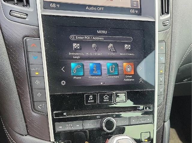 - Radio: INFINITI InTouch w/Navigation -inc: AM/FM/HD and CD, 16 speaker Bose Performance Series audio w/Bose Centerpoint simulated surround, navigation w/lane guidance, 3D building graphics, premium traffic and MapCare, voice recognition for navigation functions, including 1-shot voice destination entry, Apple CarPlay, Siri Eyes Free, Android Auto including Google Voice, Bluetooth® hands-free phone system w/text messaging assistant, voice recognition, Bluetooth® and vehicle information streaming audio via Bluetooth®, 2 illuminated USB connection ports (1 type A, 1 type C), auxiliary audio input, SiriusXM radio w/advanced audio features w/3-month complimentary trial, SiriusXM Traffic w/3 month complimentary trial access to real-time traffic information, SiriusXM Travel Link w/3 month complimentary trial access to weather, fuel prices, stock prices, sports scores, movie listings and parking and Wi-Fi hotspot